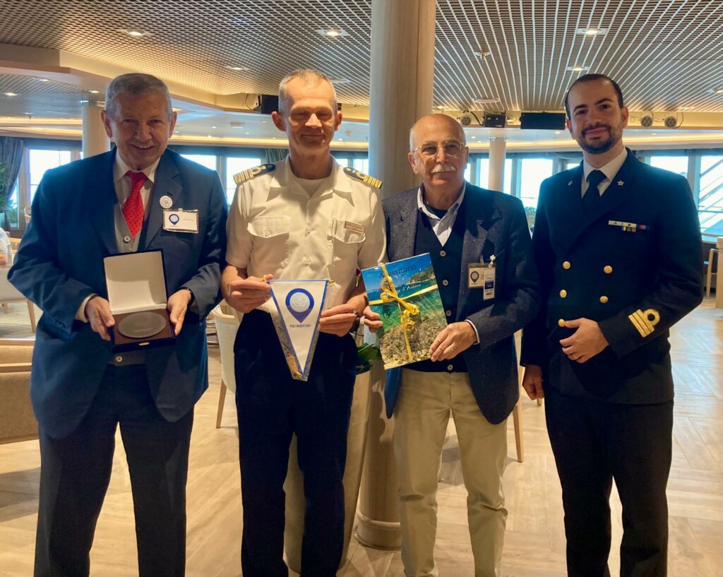 As this was Silver Muse’s maiden call in Argentario and also the first call of the season, the traditional plaque exchange ceremony took place on board. The Mayor of Argentario, Arturo Cerulli, together with the Harbour Master, T.V. (CP) Francesco Luigi Balsamo, and Fabrizio Palombo, Technical Manager of the PORTARGENTARIO hospitality project, officially welcomed the ship’s Captain and thanked him for the call.