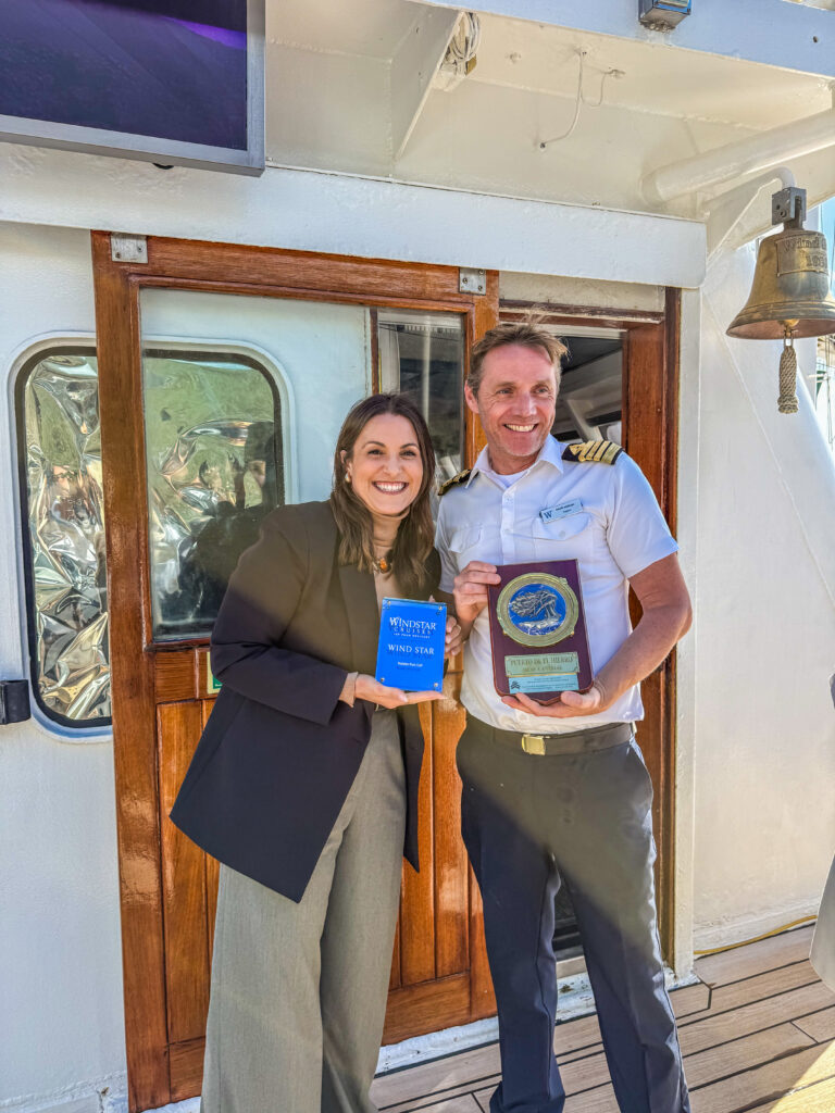 To commemorate this first call, the traditional plaque exchange was held as a symbol of welcome and institutional recognition. Captain David received the commemorative plaque alongside his crew, in a cordial meeting attended by the Regional Minister of Tourism and members of her team, underlining the institutional relevance of this inaugural visit.