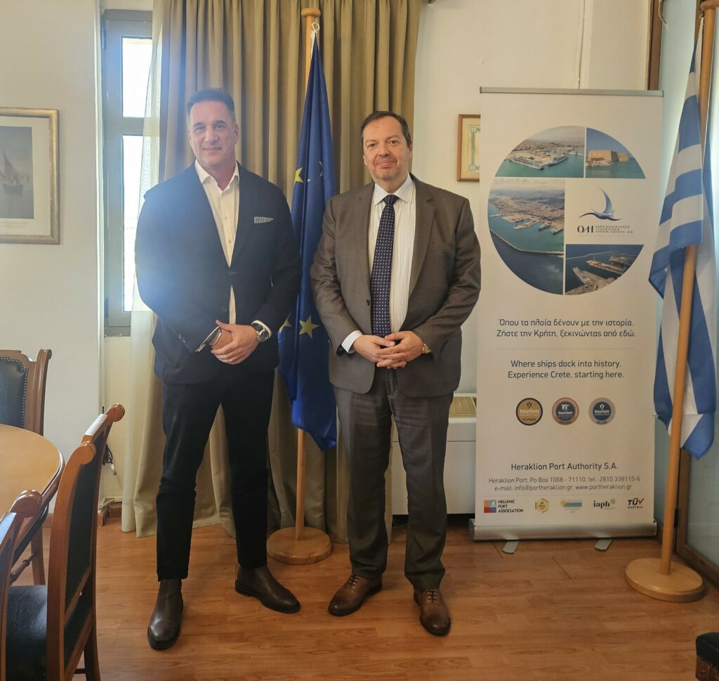 A strategic meeting was held between Mr Minas Papadakis, Chief Executive Officer of Heraklion Port Authority S.A., and Mr Nikos Anastasiou, Chief Executive Officer of Heraklion International Airport of Crete S.A., focusing on strengthening Heraklion’s position as a competitive cruise homeport in the Mediterranean.